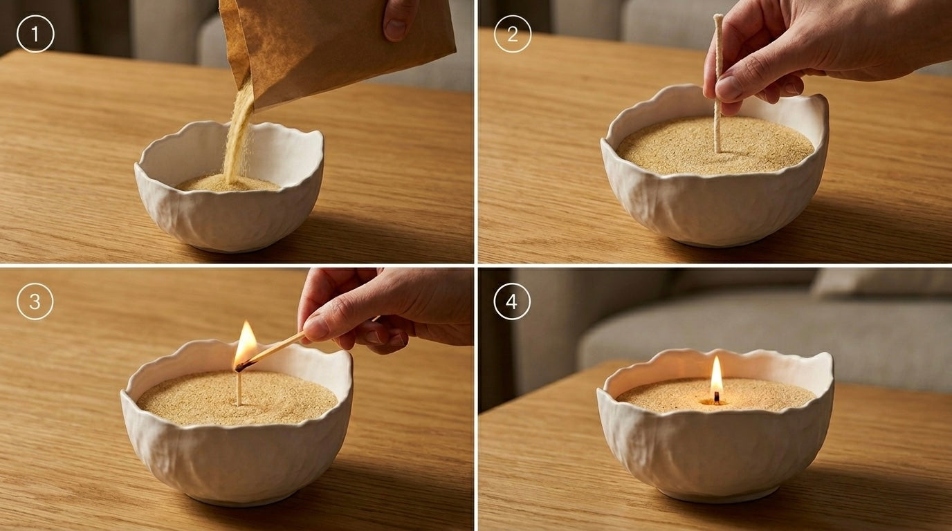 🕯️ Einfachheit trifft Kreativität: Das Aufschütten des feinen Sandes ist der Beginn deiner Auszeit. Du entscheidest über die Anzahl der Dochte und die Form deines Lichts – jedes Mal aufs Neue für deine ganz persönliche Atmosphäre.