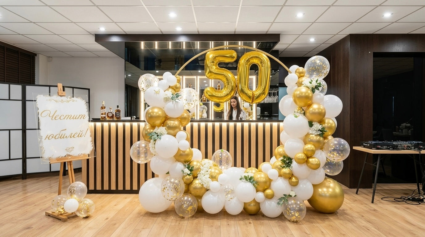 🎈 Statement-Fotowand: Das Herzstück der Feier war ein imposanter, kreisförmiger Ballonbogen, der mit einer Mischung aus weißen, goldenen und transparenten Konfetti-Ballons sowie dezenten floralen Akzenten gestaltet wurde. Die großen Gold-Zahlen „50“ im Zentrum machten die Wand zum absoluten Blickfang und zum idealen Ort für die Ehrengäste und ihre Erinnerungsfotos.