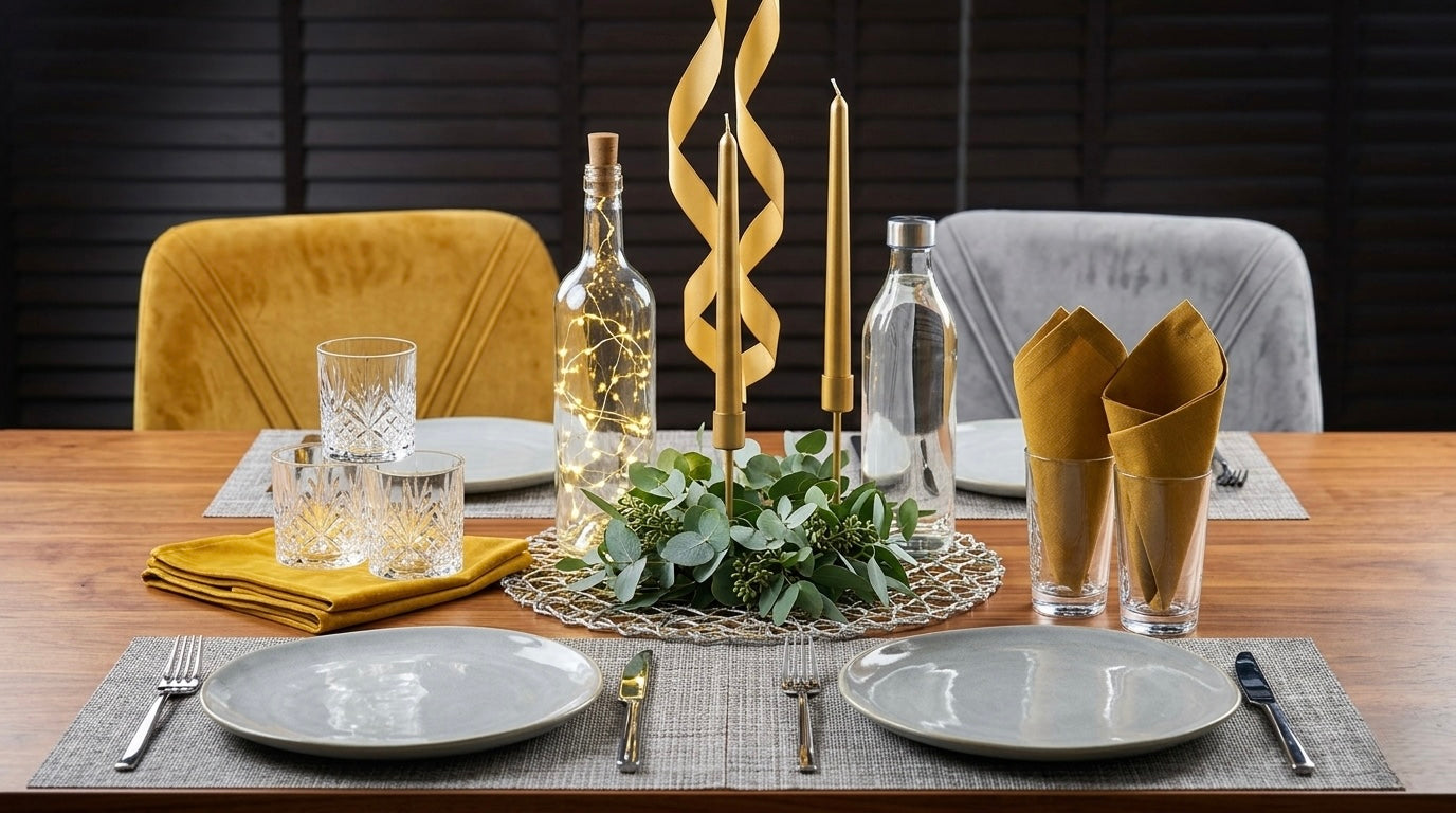 🌿 Minimalistisches Tischdesign: Passend zur festlichen Kulisse haben wir die Tische mit einer eleganten Kombination aus Eukalyptus-Grün, langen goldenen Stabkerzen und stimmungsvollen Lichterketten in Glasflaschen dekoriert. Diese feine Abstimmung zwischen natürlichem Grün und metallischen Akzenten sorgte für eine gehobene Tischkultur, die den Gästen ein exklusives Dinner-Erlebnis bot.