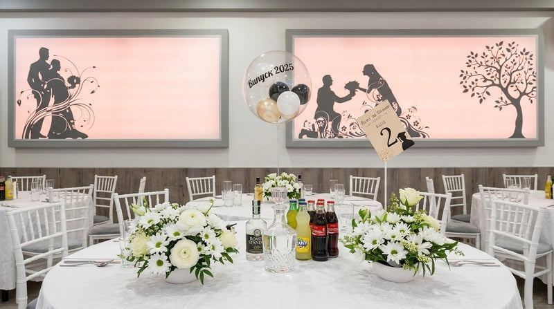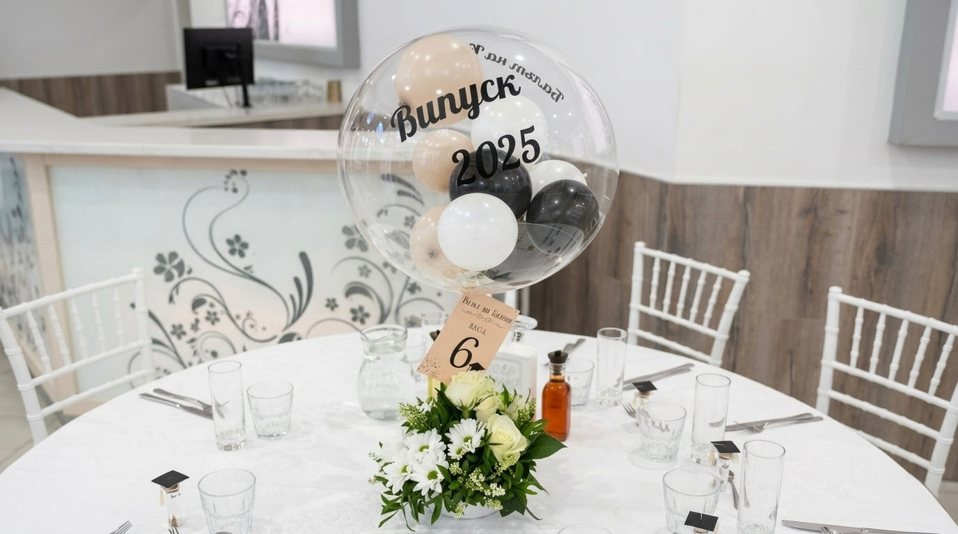 🎈 Personalisierte Akzente: Im Mittelpunkt der Tischdekoration standen unsere transparenten „Bubble-Ballons“, individuell beschriftet für den Abschlussjahrgang 2025. Ergänzt durch klassische Blumengestecke aus weißen Chrysanthemen und Rosen, entstand ein harmonisches Bild, das Tradition und moderne Event-Trends perfekt verbindet.