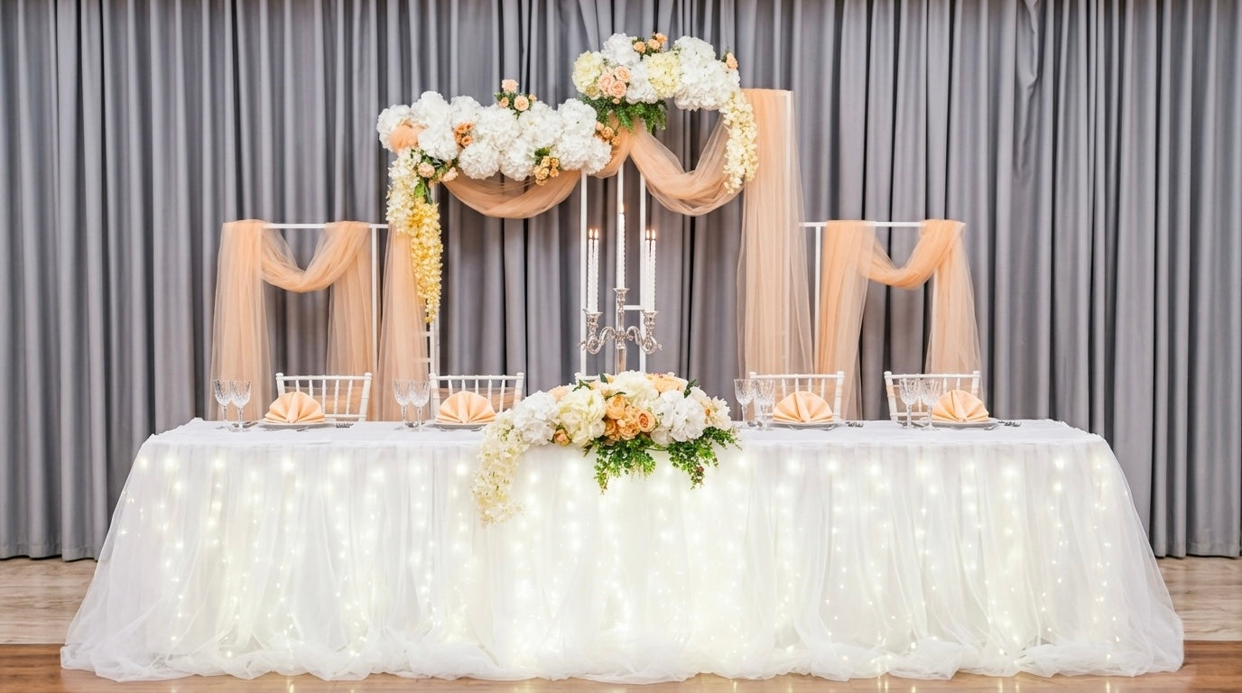 🕯️ Licht & Textur: Ein besonderes Highlight war der beleuchtete Brauttisch, der durch fließende Tüllstoffe und integrierte Lichterketten eine magische Wirkung entfaltete. Die Kombination aus schweren Vorhängen, glitzernden Kronleuchtern und den zarten Stoffbahnen am Hintergrund schuf eine luxuriöse Tiefe im Raumdesign.